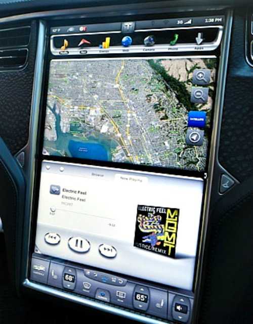 Η τεράστια οθόνη της Tesla μοιάζει και με ένα μεγάλο tablet, βρίσκεται ανάμεσα στον οδηγό και τον συνοδηγό και αναλαμβάνει να μας δείξει τις πιο σημαντικές πληροφορίες. Υπάρχει φυσικά ενσωματωμένο ένα player, σύστημα πλοήγησης και κλήση hands-free όπως και πίσω κάμερα, χειρισμός clima και τα λοιπά.