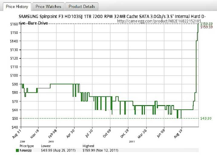 Μπορείτε δε όσον αφορά την αποθήκευση σε HDD να δείτε στοιχεία μέσω του blogger Zorinaq, που χρησιμοποίησε στο σύστημα ανίχνευσης τιμών της Camelegg.com για να δείξει πως ένα 1TB Samsung Spinpoint έχει τριπλάσια τιμή σε μερικές ημέρες.