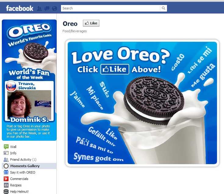 Ναι, τα μπισκότα, με την Oreo στο Facebook να φέρνει 22 άτομα ως φαν (!) ενώ από το 2009, όπου το site ήταν ειδικά για Αμερική και το 2010 η εταιρία αντιλήφθηκε πως κάπου 5 εκατομμυρία φαν ήταν εκτός ΗΠΑ. Τότε η εταιρία 360i έκανε την Facebook Page διεθνή και από τότε η εταιρία το ‘πουλάει’ με διάφορες ενέργειες για τα Guinness World Record με τα περισσότερα Likes σε 24 ώρες και άλλα…