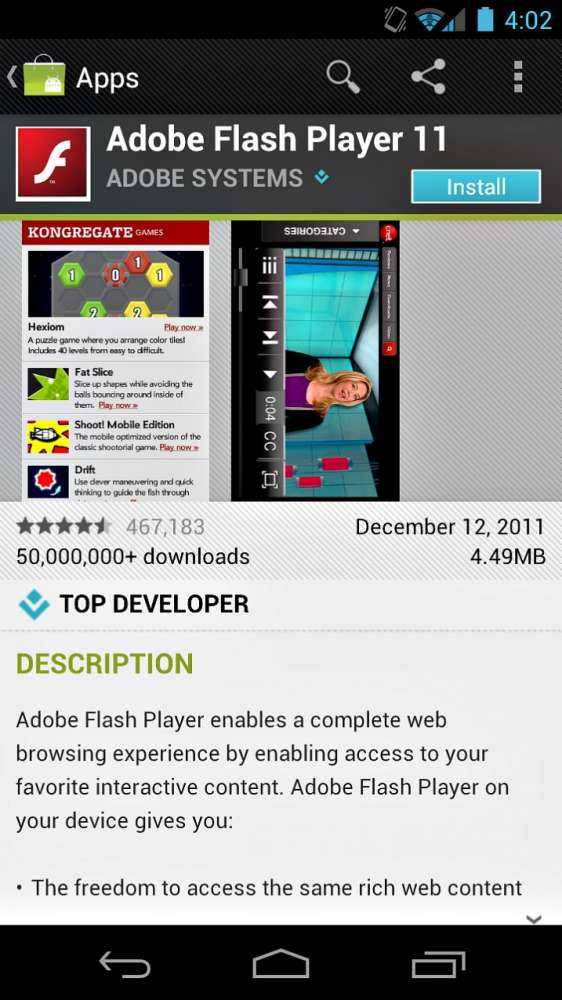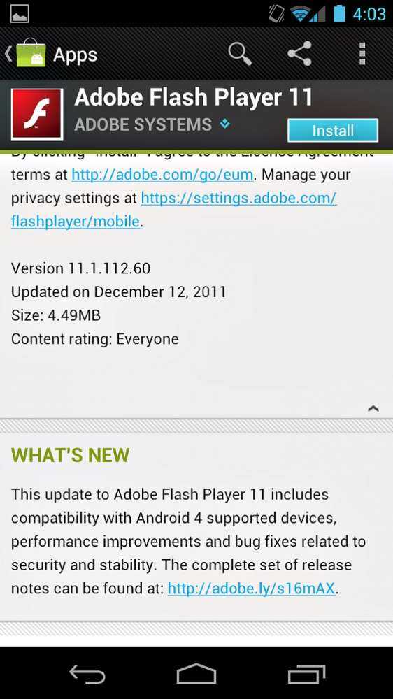 Η νέα αναβάθμιση δεν αλλάζει τη λειτουργικότητα αλλά απλά περιλαμβάνει υποστήριξη για το Android 4.0. Ουσιαστικά αυτή είναι η τελευταία από ότι φαίνεται αναβάθμιση για το mobile Flash αφού η εταιρία ανακοίνωσε πως ΔΕΝ θα υποστηρίζει το Flash πέρα από την έκδοση 11.1 για τις mobile πλατφόρμες.