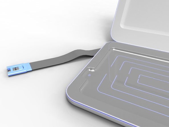 Αυτό είναι ένα έξυπνο σχέδιο: χρησιμοποιεί ασύρματη τεχνολογία φόρτισης και είναι δημιούργημα του κυρίου Brad Ascalon, που χρησιμοποιεί τεχνολογία φόρτισης χωρίς επαφή – wireless charging technology και έτσι είναι ένα σε δύο. Και φέρει τον υπολογιστή και στο λουρί έχει USB male σύνδεση από τη μια και πρίζα από την άλλη. Επιπλέον η ίδια θύρα USB κάνει την τσάντα να λειτουργεί και σαν drive αποθήκευσης.