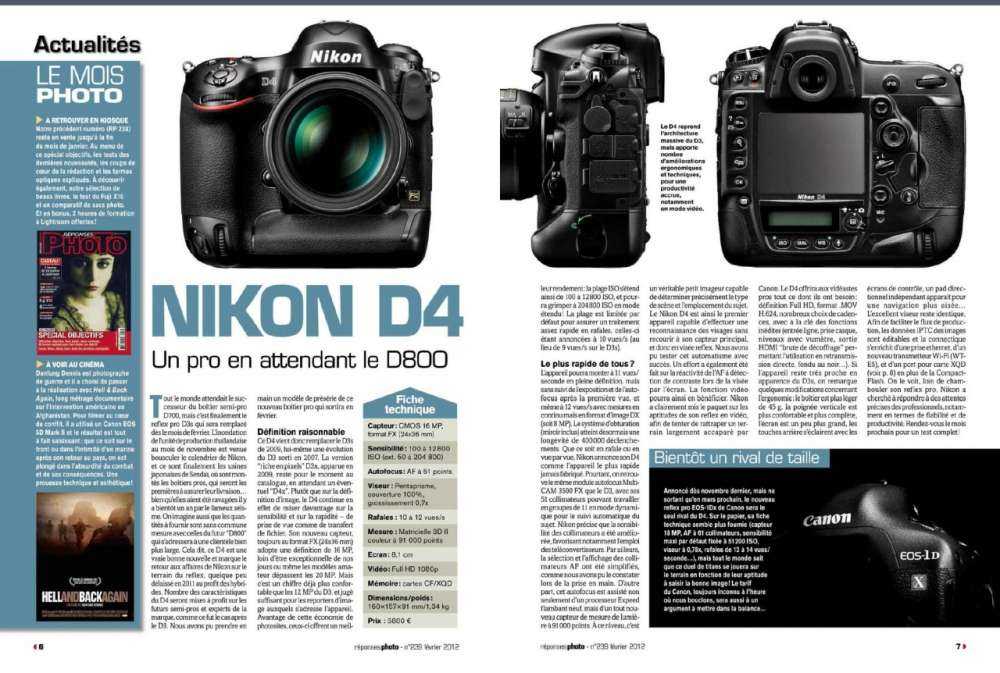 Αυτή είναι η νέα D4, η ναυαρχίδα των 6000 δολαρίων της Nikon για την οποία έχουμε πει. Το μηχανάκι ήδη το παρουσίασε το Réponses Photo. Με αισθητήρα 16 megapixels, ISO 100-12800 (μέχρι και 50-204800), 51 autofocus σημεία, 100% viewfinder κάλυψη, 10-12fps, 91000 σημείων σύστημα μέτρησης, 1080p βίντεο, CF/XQD θύρες κάρτων, 1.34 κιλά βάρος.