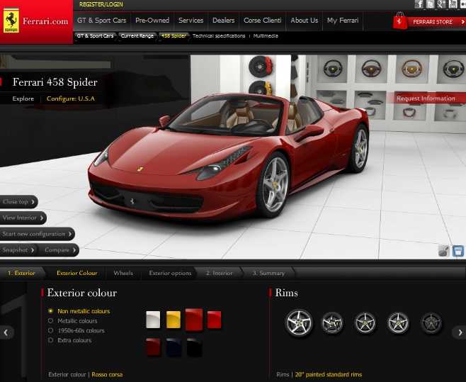 Η Ferrari ετοίμασε τον δικό της online configurator για αυτό το πανέμορφο δημιούργημα, τη 458 Spider. Με το online εργαλείο αυτό μπορεί να ετοιμάσει κανείς – crafting και customizing του Ferrari roadster.