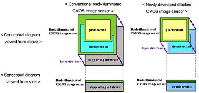 H νέα δομή επιτρέπει στον CMOS αισθητήρα να δίνει καλύτερη ποιότητα εικόνας και λειτουργικότητα ενώ ο νέος αισθητήρας έχει μικρότερα στοιχεία και ‘δίνει’ μικρότερες κάμερες. Η Sony ονομάζει τον αισθητήρα “stacked CMOS sensor.”