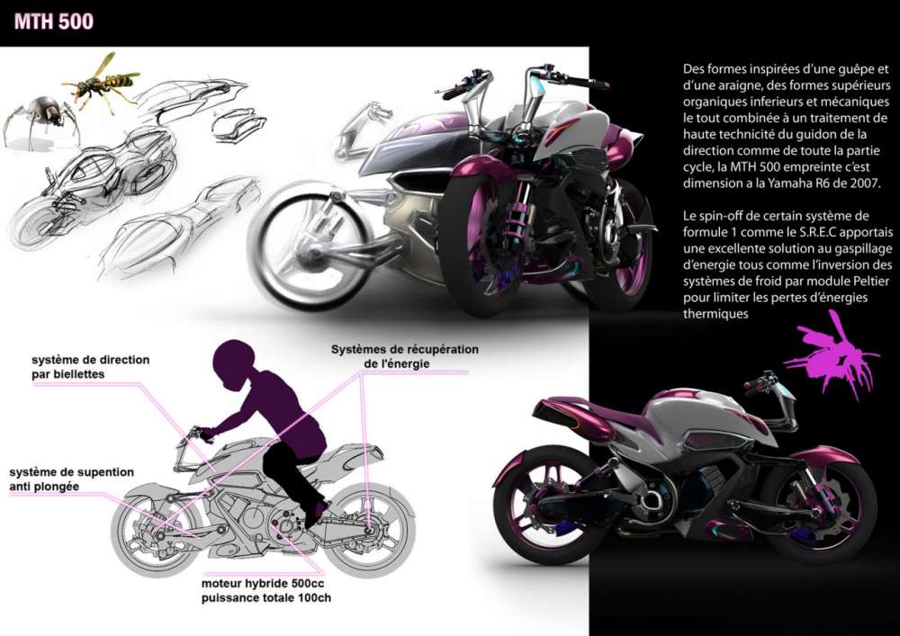 Με βάση τις διαστάσεις μιας 2007 Yamaha R6, το MTH 500 είναι η ιδέα για ένα hi-tech δίκυκλο με τη φιλοσοφία των ‘naked΄μοντέλων και εστιάση στην τεχνολογία και έναν ‘ενθουσιασμένο’ αναβάτη…