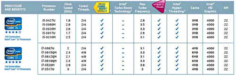 Στα μοντέλα για notebook τα μοντέλα ξεκινούν με 1.7GHz, 1.8GHz και 2GHz low-voltage Core i5 και i7 μοντέλα που θα πάνε στους ultrabooks. Οι ‘κανονικοί’ dual-core ξεκινούν από τα 2.5GHz Core i5 και φτάνουν τα 2.9GHz Core i7.