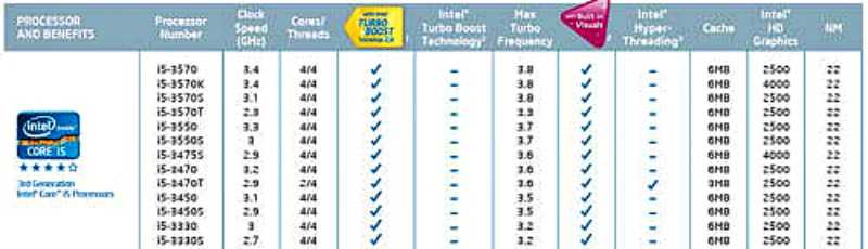 Για τους desktop επισήμως φαίνεται να έχουμε μόνο quad Core i5 μοντέλα από τα πλέον χαμηλής ενέργειας μοντέλα 2.3GHz i5-3570T μέχρι τα 3.4GHz i5-3570. Μοναδική εξαίρεση ένας dual-core, 2.9GHz i5-3470T, με 6MB cache και Hyperthreading. Αυτά τα μοντέλα λειτουργούν με τέσσερα tasks σε αντίθεση με τους οκτώ των Core i7.