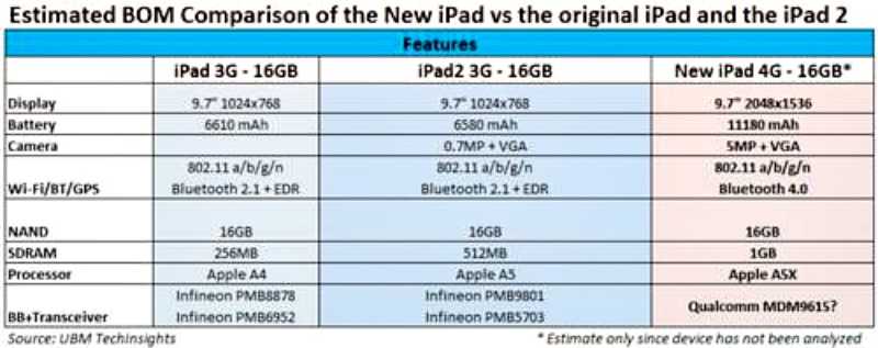 Η ανάλυση έγινε από την UBM TechInsights και δείχνει πως μόνο τέσσερα από τα ‘συστατικά’ έχουν ανεβάσει το κόστος: “higher-resolution display, the newer A5X processor, the LTE radio modem and the expanded battery.”