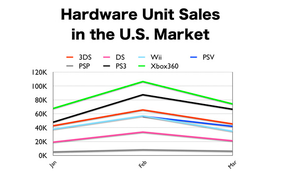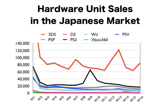 Στην ιαπωνική αγορά πάντως το 3DS είναι στην πρώτη θέση με 65,000 έως και 120,000 μονάδες την εβδομάδα και το PS3 έφτασε τις 70,000 μονάδες. Το δε Xbox 360 είναι εξαιρετικά μη δημοφιλές και μετα βίας εγγράφεται.