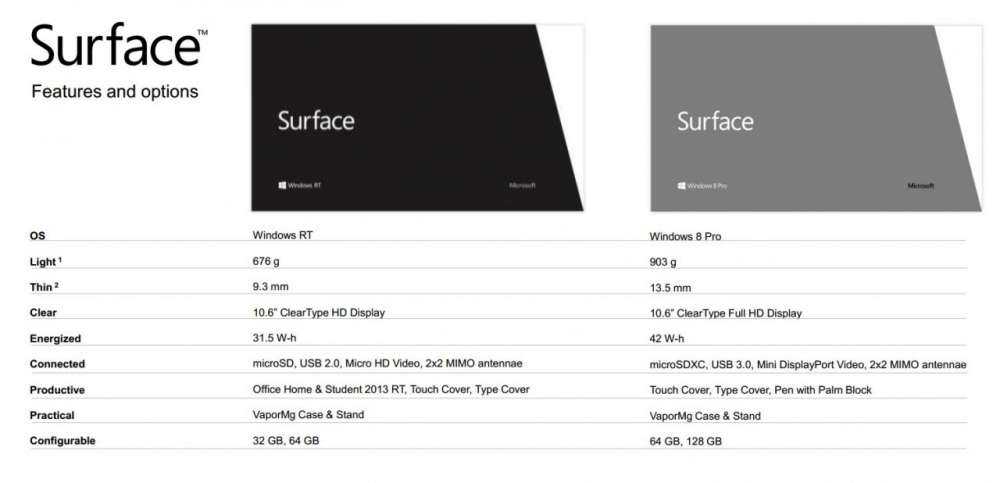 Το Windows RT θα ζυγίζει 676 γραμμάρια, θα έχει πάχος 9.3 χιλιοστά κα η Microsoft λέει, πως η οθόνη θα έχει μέγεθος 10.6″, 16:9 ClearType HD. Η μπαταρία είναι 31.5W-h, η επιλογή 32GB ή 64GB σε on-board αποθηκευτικό χώρο και υπάρχουν MicroSD, USB 2.0, Micro HD βίντεο και 2×2 MIMO κεραίες και WiFi. Το πιο σημαντικό: ο επεξεργαστής; κατά πάσα πιθανότητα ένας Tegra 3.