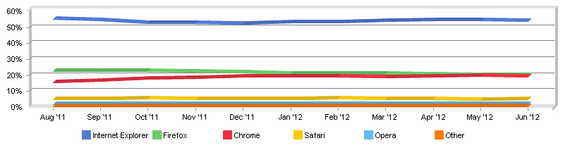 … όπως λέει το mashable, το Net Applications δίνει στον Chrome μερίδιο στο 19.08%, 1% πιο πίσω από τον Mozilla Firefox με το 20.06% αν και το μερίδιο του Chrome στην αγορά έχει πάρει 5% σε έναν χρόνο και ο Firefox έχει χάσει το 3% με τον IE να μένει στο 54.02%. Αν και η Google λέει πως ΕΙΝΑΙ ήδη ο top browser, τα δεδομένα της Net Applications βλέπουν τους unique users για να δουν μερίδιο αγοράς και η StatCounter, βλέπει το overall traffic σε 3 εκατομμύρια sites.