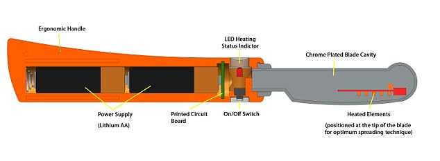 Είναι το θερμαινόμενο μαχαίρι που για ισχρύ έχει την εξωτερική θερμοκρασία. Με την τεχνολογία αυτή η θερμοκρασία μένει στους 41.8 Celsius, στο λεπίδα ενώ υπάρχουν και δύο AA μπαταρίες στο χερούλι.