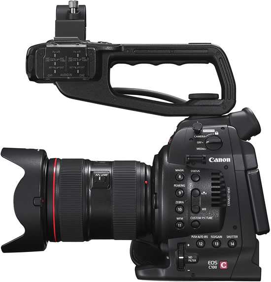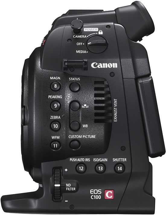 H new Canon EOS C100 digital video camera δίνει δυνατότητα push auto iris, one-shot auto focus (ή full manual focus και exposure control), ένα multi-angle 3.5-inch LCD panel ελέγχου, high-resolution electronic viewfinder (EVF), ενσωματωμένα ND φίλτρα, διπλά XLR inputs και locking HDMI έξοδο.