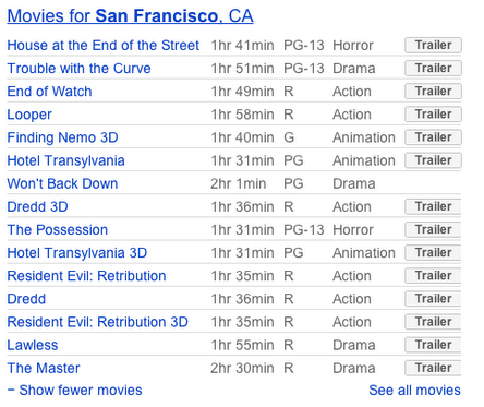 Φαίνεται λοιπόν πως τα trailers αρχίζουν να εμφανίζονται πλέον και ένας user απλά ρίχνει ένα search term όπως “showtimes zip code” ή “showtimes city name” ώστε η Google να δώσει τις ταινίες που παίζονται κοντά του.
