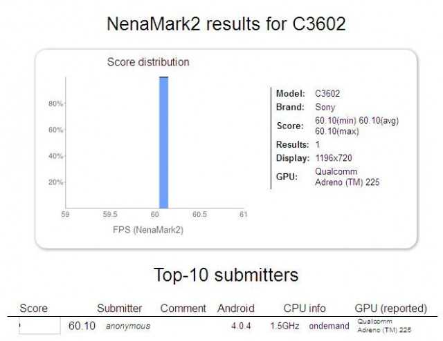 Με βάση το benchmark το C3602 είναι των 1280×720 με 1.5GHz CPU. Κατά πάσα πιθανότητα quad-core ενώ η Adreno 225 GPU για τα γραφικά σημαίνει Snapdragon S4. Στις δοκιμές τρέχει Android 4.0.4 Ice Cream Sandwich.