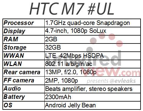 Το HTC M7 θα έχει 1.7GHz έναν επεξεργαστή Snapdragon quad-core, 2 GB RAM και 32GB αποθηκευτικό χώρο ενώ το μοντέλο θα έχει και LTE και 42Mbps HSDPA με φωτογραφική που θα έχει 13-megapixel. Στο θέμα της οθόνης αναμένεται να έχει μια οθόνη στις 4.7” 1080p SoLux, μια οθόνη που υπόσχεται πως θα έχει καλύτερες επιδόσεις από τις SLCD2 των One series. Στο λειτουργικό Jelly Bean και Sense 5 ενώ δεν έχουμε τίποτα για τιμές.