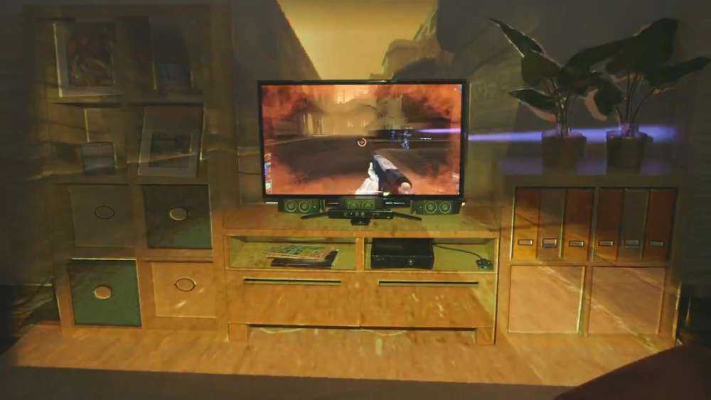 Η Microsoft έδειξε κάποιον να παίζει Xbox games και να ‘συμμετέχει’ ο χώρος ενώ τελικά είναι ένα Microsoft Research project που χρησιμοποιεί το Kinect με μια Windows κάμερα και επεξεργαστή. Φαίνεται πως “uses the appearance and the geometry of the room (captured by Kinect) to adapt the projected visuals in real-time without any need to custom pre-process the graphics.”