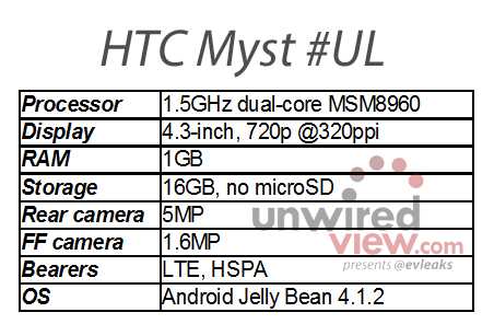 Τώρα μια πηγή δίνει στοιχεία για ένα HTC Myst με dual-core 1.5GHz MSM8960 system-on-a-chip, 1GB RAM, 16GB μνήμη.