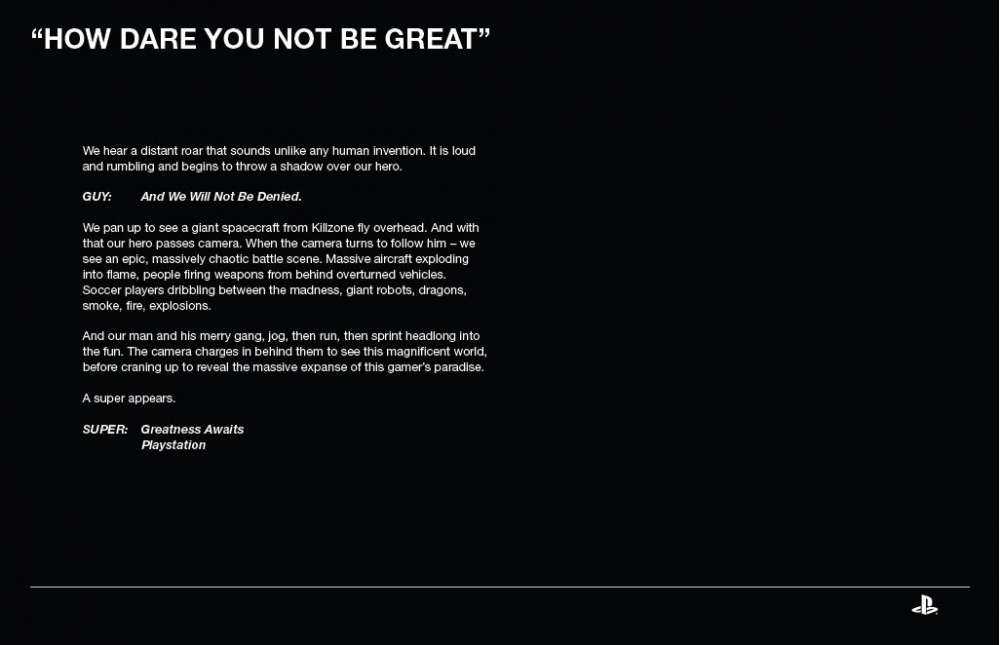 Τώρα φαίνεται πως μερικά τμήματα της καμπάνιας της Sony για το PS4 διέρρευσαν όπως λέει το Siliconera. Η καμπάνια marketing θα έχει τον υπότιτλο “Greatness Awaits.” Πολλές περιγραφές για κανονικά διαφημιστικά έχουν βγει στην επιφάνεια με ήρωα έναν κοινό άνθρωπο να μιλά με gamers για τις ικανότητες τους με παραπομπές σε games όπως το δημιούργημα της Bungie, το Destiny or Killzone: Shadow Fall, που θα εμφανιστούν στο PlayStation 4.