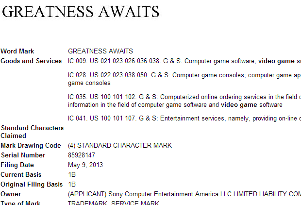 Το δε Siliconera βρήκε και ένα trademark της Sony για το “Greatness Awaits” που τελικά επιβεβαιώνει την στρατηγική promotional της εταιρίας…