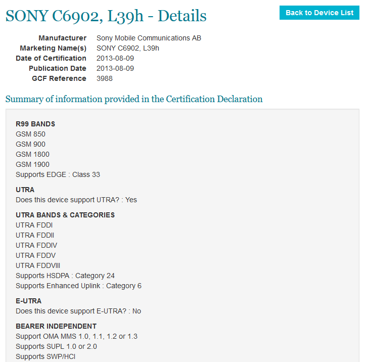 Το κινητό θα φτάσει στην αγορά ως Xperia i1 και έχει λάβει πιστοποίηση από το Global Certification Forum. Στον δε GCF πέρασαν δύο εκδόσεις. μια με συνδεσιμότητα HSPA, το C6902/L39h και μια με 4ης γενιάς, LTE δυνατότητες, το C6903. Το δε C6902 θα υποστηρίζει GSM (850, 900, 1800, 1900) και WCDMA (2100, 1900, 1700, 850, 900) και όπως λέει ένα post στο techkiddy πάει για Κίνα κυρίως, και το L39h θα είναι διεθνής έκδοσης. Το δε Xperia i1 Honami C6903 έχει λάβει πιστοποίηση για GSM (850, 900, 1800, 1900), WCDMA (2100, 1900, 1700, 850, 900) και LTE 2100(B1), 1800(B3), 1700(B4), 850(B5), 2600(B7) και 800(B20) δίκτυα και θα έρθει σε Ευρώπη, Ιαπωνία και άλλα σημεία του… ορίζοντα.