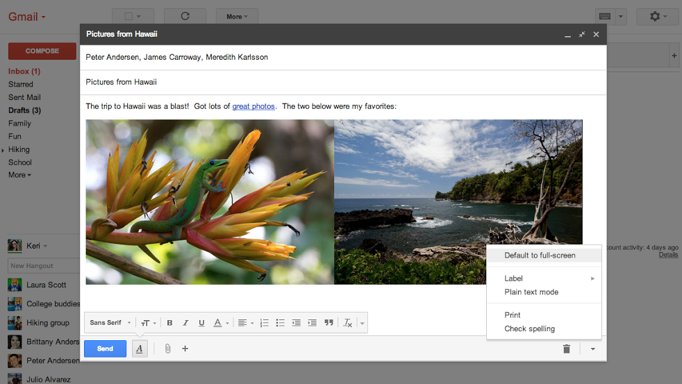 Τι άλλο; μπορείς να ανοίξεις drafts σαν minimizable window για να ετοιμάσεις και multiple drafts μαζί ενώ ελέγχεις τα email, με υποστήριξη για inline εικόνες. Μπορείς δε να επιλέξεις και full-screen compose…
