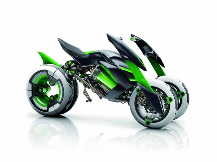 Είναι το Kawasaki J concept που πολύ απλά ενθουσιάζει με την ιδέα: τρίτροχο που μετατρέπεται σε sport bike. Είναι το λεγόμενο Sport Mode με τους δύο μπροστά τροχούς να γίνονται ένα και να χαμηλώνει το κέντρο βαρύτητας.