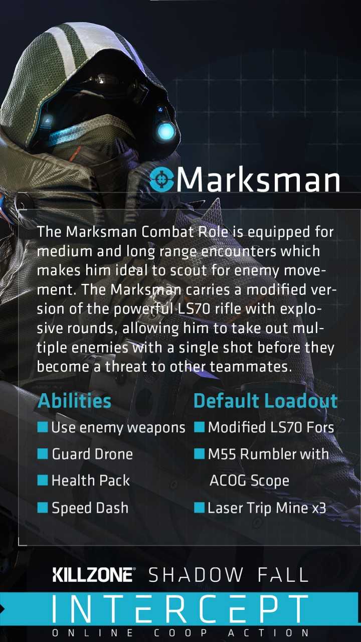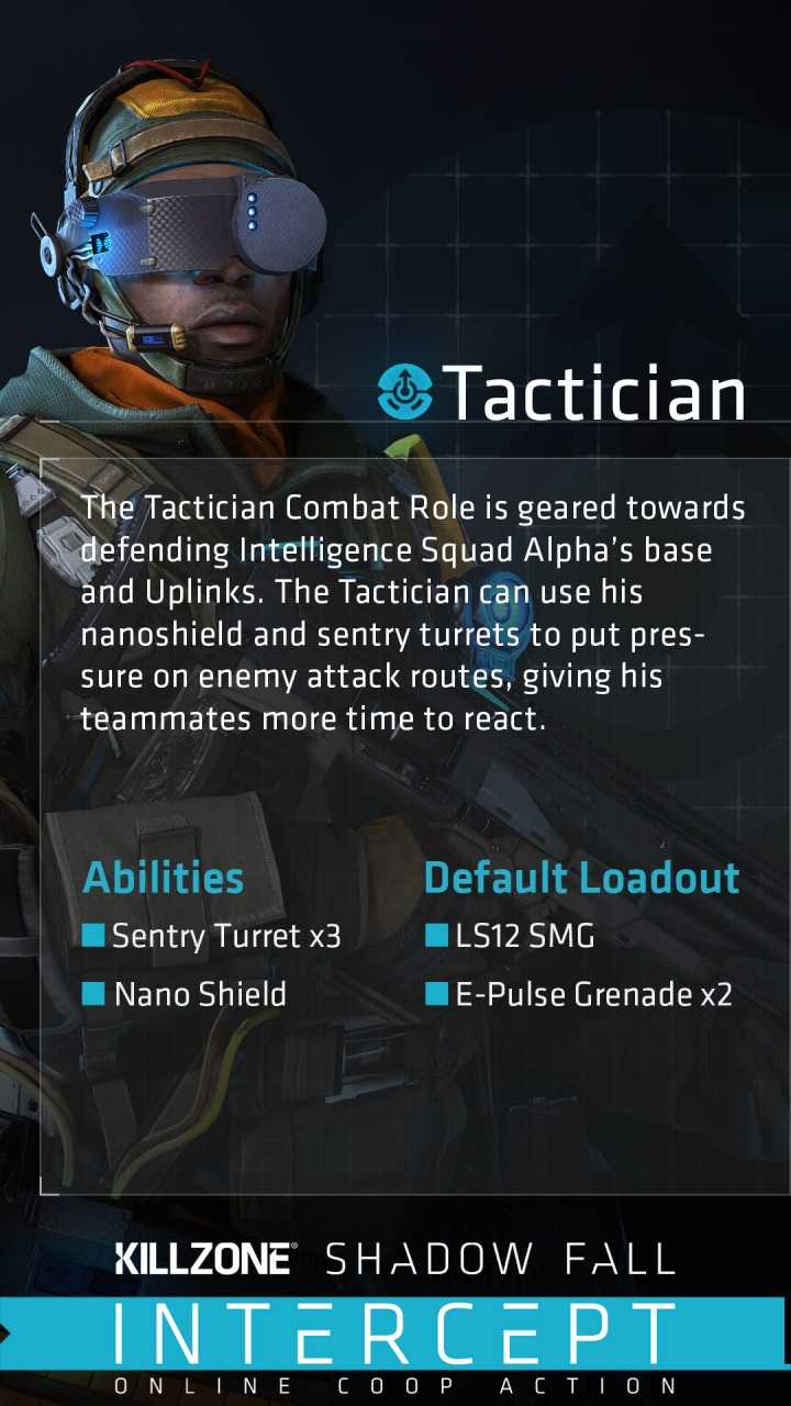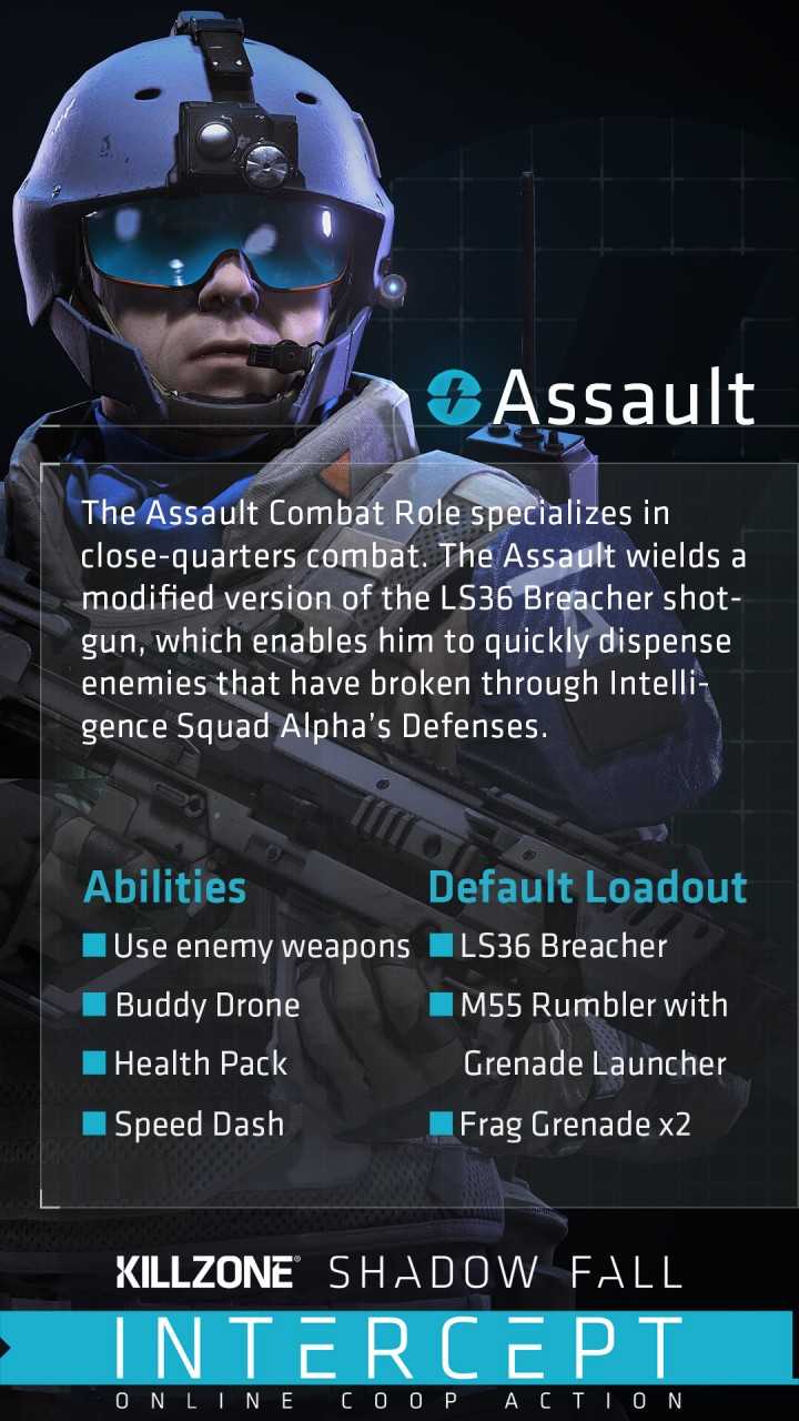 Killzone Shadow Fall Intercept places you and up to three of your friends on the elite VSA team known as Intelligence Squad Alpha. Operating behind enemy lines, your team is on a mission to intercept and relay Helghast military transmissions back to VSA headquarters. To succeed, you’ll need to keep Helghast interlopers at bay long enough to establish a Hacking Uplink and transmit the data. Thankfully, the members of your team have all been trained in unique Combat Roles – from close-quarters Assault and mid-to-long range Marksman roles to supportive Medic and Tactician roles.