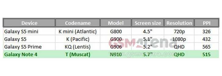 Από την άλλη, υπάρχει μια φήμη: μιλά για ένα Samsung Galaxy Note 4 με 5.7αρα όπως και το προηγούμενο phablet το Samsung T. Στη διαρροή του GSMArena, το Galaxy Note 4 μιλά για ανάλυση QHD (1440 x 2560 pixels), στα 515ppi ενώ το έγγραφο μιλά και για ένα άλλο, το Galaxy S5 Prime με 5.2αρα QHD και 565ppi (pixel density).