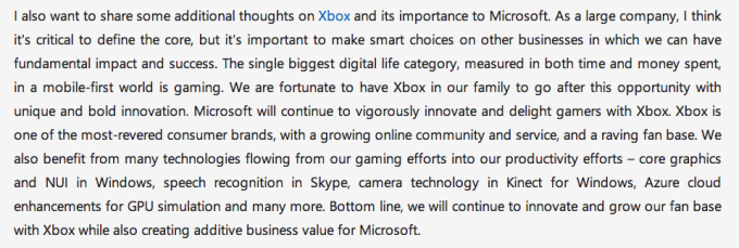 Τι συμβαίνει λοιπόν; η Microsoft δεν πουλά Xbox και Bing. Θα πουλήσουν τη μονάδα Xbox; όπως μαθαίνουμε όταν βρήκαν τον νέο τους CEO Shuffle, το Bloomberg σημείωσε πως ο τότε άνθρωπος της Nokia, ο Stephen Elop, ήθελε να πουλήσει το Xbox αν είχε πάρει τη θέση για να εστιάσει η εταιρία στα υπόλοιπα Windowsικά. Πάντως η εταιρία θα υποστηρίξει και άλλες πλατφόρμες…