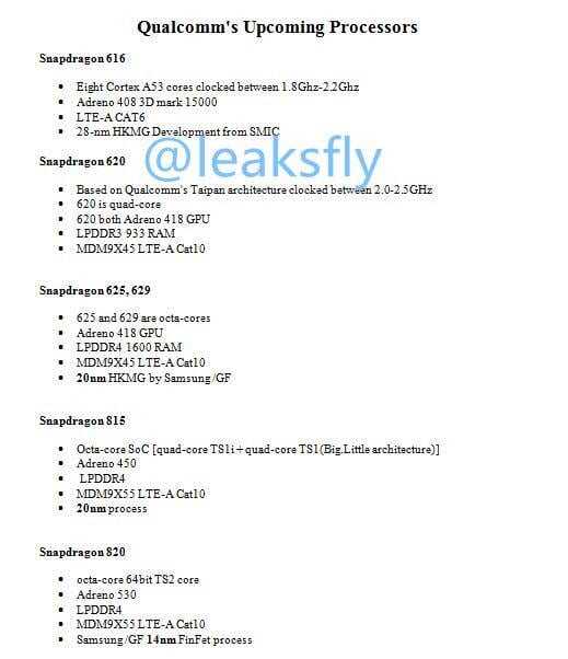 Επεξεργαστές δηλαδή. Και αφού ξέρουμε για το Qualcomm Snapdragon 810 που θα είναι σε όλα τα high-end smartphones φέτος το ερώτημα είναι: μετά; μετά το Snapdragon 820 που όπως φαίνεται σε ένα Qualcomm roadmap που έχει στα χέρια του το @leaksfly – από το Droid-Life), η Qualcomm δουλεύει πάνω στα Snapdragon 616, Snapdragon 620, Snapdragon 625, Snapdragon 629, Snapdragon 815 και Snapdragon 820.