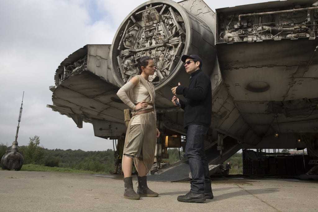 L to R: Director J.J. Abrams w/ actress Daisy Ridley (Rey) on set.