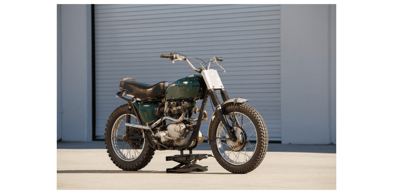Αυτή είναι η θρυλική μηχανή Steve McQueen 1963 Triumph Bonneville Motorcycle. Από μόνη της ένα ξεχωριστό εξάρτημα της ιστορίας του motoring. Ο Bud Ekins, φίλος και stunt double του McQueen έκανε τις τροποποιήσεις για off-road αγώνες και μετά την έδωσε στον Kenny Howard (Von Dutch) για να τη βάψει με συγκεκριμένο τρόπο.