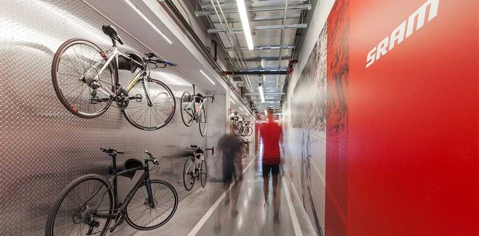 Η SRAM, μια από τις μεγαλύτερες εταιρίες κατασκευής εξαρτημάτων για ποδήλατα, ζήτησε από το αρχιτεκτονικό γραφείο Perkins+Will να σχεδιάσουν γραφεία για… ποδηλάτες. Και ιδού, σε 72,000 τετραγωνικά πόδια, το κτίριο των 1920s έχει ένας καταπληκτικός χώρος εργασίας για τους 150 υπαλλήλους και μέχρι 200 bike racks είναι έτοιμα για τους ecoλογικούς δύο τροχούς τους.