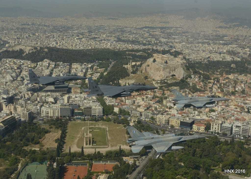 Στο τέλος της άσκησης «Ηνίοχος 2016», μικτός σχηματισμός αεροσκαφών F-16 Block 52+ Advance της Πολεμικής Αεροπορίας και F-15E Strike Eagle των Αμερικανικών Αεροπορικών Δυνάμεων Ευρώπης σε μια συνηθισμένη για τις ΠΑ πτήση πάνω από διάσημα μνημεία πάνω από τον Ιερό Βράχο της Ακρόπολης.