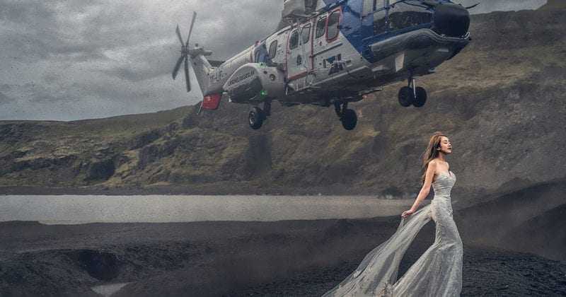Τίποτα δεν ήταν στημένο. Τότε πως;! Κι όμως, έτυχε. Έτυχε στο σημείο που είχε επιλέξει το συνεργείο για τη φωτογράφιση να είναι ένα βαρύ διασωστικό ελικόπτερο της Icelandic Coast Guard, ένα Super Puma σε αποστολή. Το ελικόπτερο χωρίς να έχει θέα της φωτογράφισης από το σημείο απογείωσης προσέφερε μια ευκαιρία για καρέ απλά ανεπανάλληπτα καθώς οι 3.600 ίπποι του ήταν σε πλήρη λειτουργία. Απογείωση που, άθελα της, η ψύχραιμη νύφη εκμεταλεύτηκε στο έπακρο.