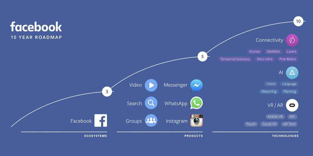 Ο ιδρυτής και CEO της εταιρίας, Mark Zuckerberg μίλησε για το δεκαετές σχέδιο της εταιρίας του, το roadmap που έχει ετοιμάσει στο F8 Developer Conference τον Απρίλιο του 2016 και φαίνεται πως πέρα από social media, έχει στόχο να ετοιμάσει internet για όλο τον κόσμο, όπως και virtual reality (VR) αλλά και Τεχνητή Νοημοσύνη.