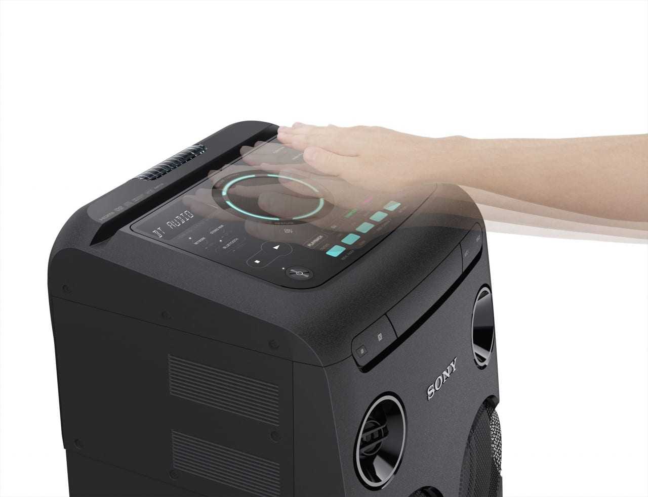 Το V77, με τη λειτουργία Space illuminating lighting, εκπέμπει πολύχρωμο φως από το ταβάνι μέχρι το πάτωμα, ταυτόχρονα με το ρυθμό. Η λειτουργία ελέγχου κινήσεων παραμένει εξίσου διαδραστική όπως και στον προκάτοχό του, το MHC-V7D. Έχουν προστεθεί δυο καινούργιες πινελιές, το πλήκτρο αφής και η αποκλειστική λειτουργία φωτισμού με συγκεκριμένο θέμα. Στο βελτιωμένο σχεδιασμό του έχει προβλεφθεί η επάνω επιφάνειά του να είναι splash-proof, ώστε να μην ανησυχείτε όποτε πλησιάζουν κοντά του ποτήρια με ποτά.
