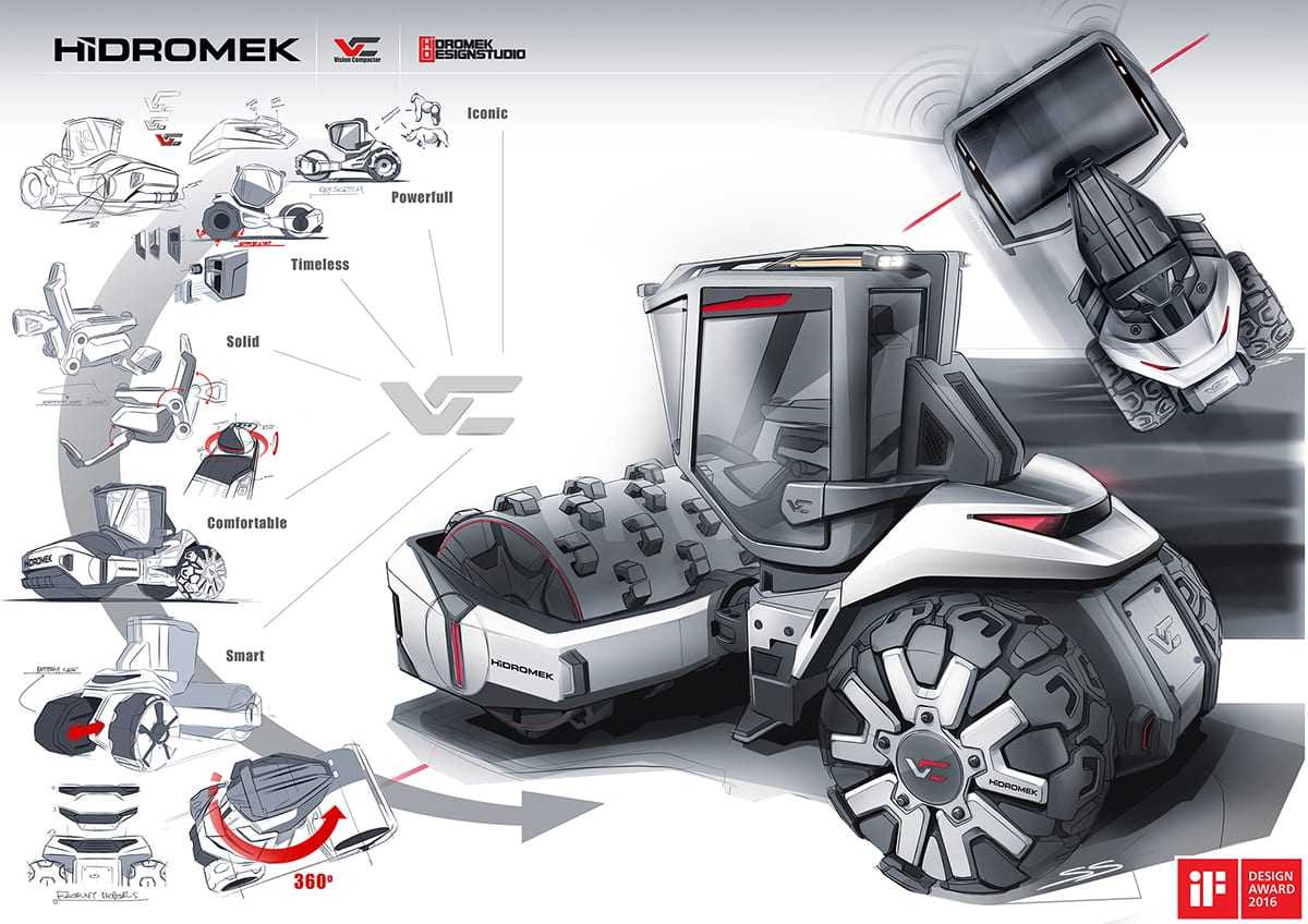 Αυτό, είναι το 15τονο HMK Vision Compactor concept. Σχεδιαστής ο κος Hakan Telesik, υπεύθυνος της εταιρίας Hidromek στο τμήμα σχεδιασμού. Το όραμα; Να δει 10 χρόνια μπροστά στον τομέα των τεχνολογικών εξελίξεων. Πρωτοποριακό, με έναν σχεδιασμό που ονομάζεται “Shape-Shifting”, ότι και να σημαίνει αυτό…