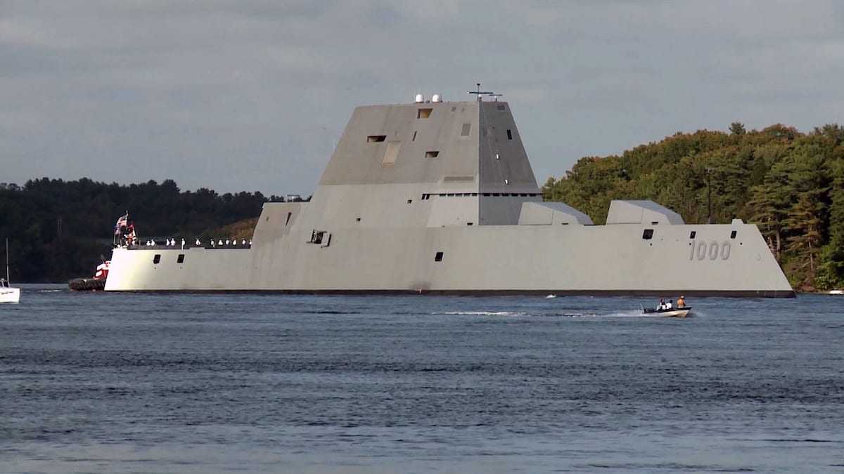 [BATH, Maine (Sept. 7, 2016) Video frame grab showing the future USS Zumwalt (DDG 1000) departing Bath Iron Works marking the beginning of a 3-month journey to its new homeport in San Diego. Crewed by 147 Sailors, Zumwalt is the lead ship of a class of next-generation multi-mission destroyers designed to strengthen naval power. They are capable of performing critical maritime missions and enhance the Navy’s ability to provide deterrence, power projection and sea control. (U.S. Navy video/Released)]