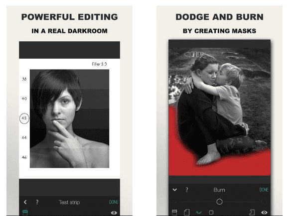 Αναπαριστά τη διαδικασία του σκοτεινού θαλάμου. Ένας κανονικός σκοτεινός θάλαμος αλλά digital.Το δε camera roll μας ‘εμφανίζεται’ σαν αρνητικά και το digital test strip αυτό βοηθά να βρεθεί το σωστό look. Μετά υπάρχει και editor όπου μπορείς να κάνεις crop, rotate, dodge, burn, blur και tone την εικόνα. Με ενσωματωμένα camera modes, ακόμη και ένα που μοιάζει με μεσαίου format. Και όλα σε μαύρο και άσπρο..
