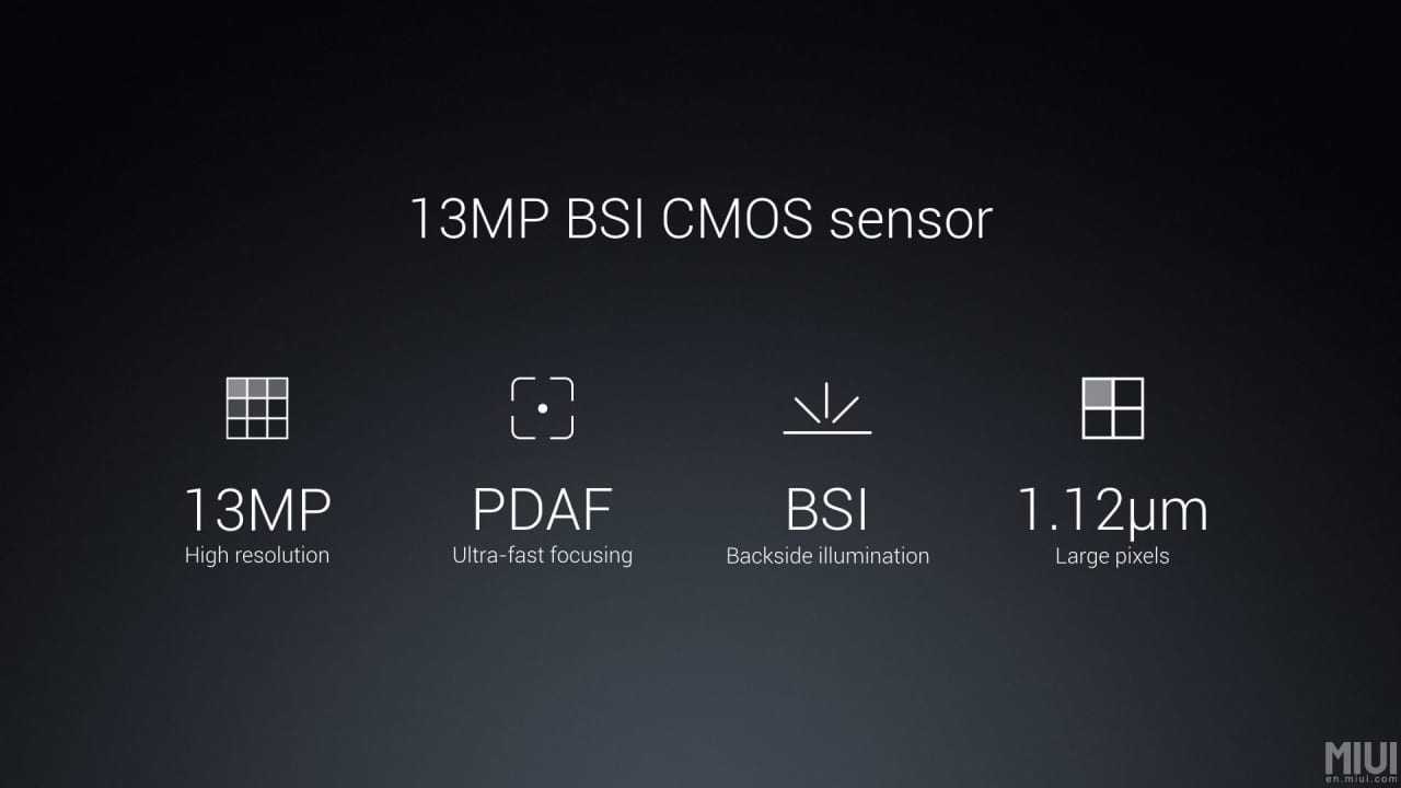 – 13MP CMOS rear camera with PDAF, f/2.0 aperture, BSI (1.12 micron pixels); 5MP, f/2.0 aperture front camera