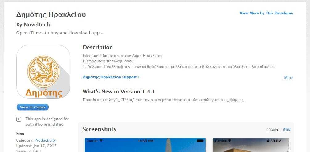 Πρόκειται για μια διαδραστική, ‘έξυπνη’ εφαρμογή που δημιούργησε ο Δήμος Ηρακλείου και μπορεί να εγκαταστήσει ο κάθε πολίτης σε κινητό τηλέφωνο ή τάμπλετ και του δίνει τη δυνατότητα να καταγράφει και στη συνέχεια να ενημερώνει την αρμόδια υπηρεσία του Δήμου όλο το 24ωρο αλλά και να ενημερώνεται για εκδηλώσεις και ότι άλλο έχει σχέση με την πόλη: «μέσω αυτής (της εφαρμογής) μπορούνε κυρίως να δηλώσουν προβλήματα της πόλης. Να τους αλλάξουν κάποια λάμπα που έχει καεί, να καλύψουν κάποια λακκούβα στο δρόμο, στη γειτονιά τους, να κλαδέψουν κάποιο δέντρο και πολλές άλλες υπηρεσίες τις οποίες μπορεί να φωτογραφίσει και να στείλει το αίτημα του (για αυτές) μαζί με φωτογραφία του προβλήματος», αναφέρει ο κ. Μοχιανάκης.