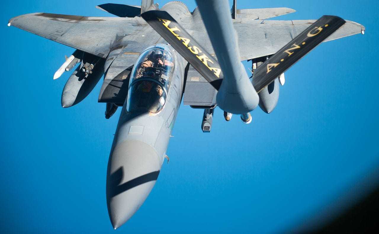 A U.S. Air Force F-15 Strike Eagle approaches a KC-135 Stratotanker over Iraq in support of Operation Inherent Resolve Oct 6, 2016. The KC-135 provides the core aerial refueling capability for the U.S. Air Force and has excelled in this role for more than 50 years. (U.S. Air Force photo by Staff Sgt. Douglas Ellis/Released)