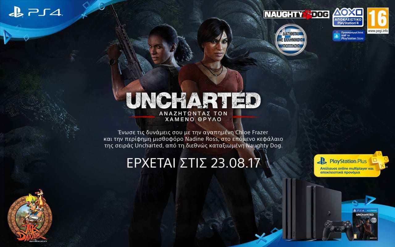 Η αντίστροφη μέτρηση για την επιστροφή του Uncharted, ενός από τους πιο επιτυχημένους αποκλειστικούς τίτλους του PlayStation® παγκοσμίως ξεκίνησε! Η νέα συναρπαστική περιπέτεια «Uncharted: Αναζητώντας τον Χαμένο Θρύλο» θα κάνει την εμφάνισή της στα ράφια των καταστημάτων και στο PlayStation® Store, στις 23 Αυγούστου 2017 και κάθε προ-παραγγελία θα φέρνει μαζί και ένα δώρο έκπληξη, το αγαπημένο Jak & Daxter.