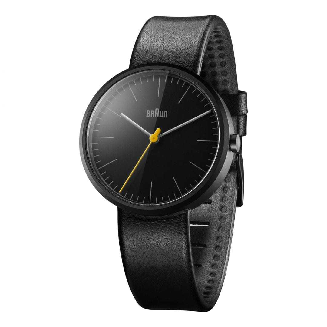 Με 42mm μαύρη ceramic κάσα και scratch-resistant ορυκτό γυαλί, δερμάτινο λουράκι όπως και τη γνωστή σχεδίαση Braun με κίτρινο λεπτοδείκτη και quartz μηχανισμό.