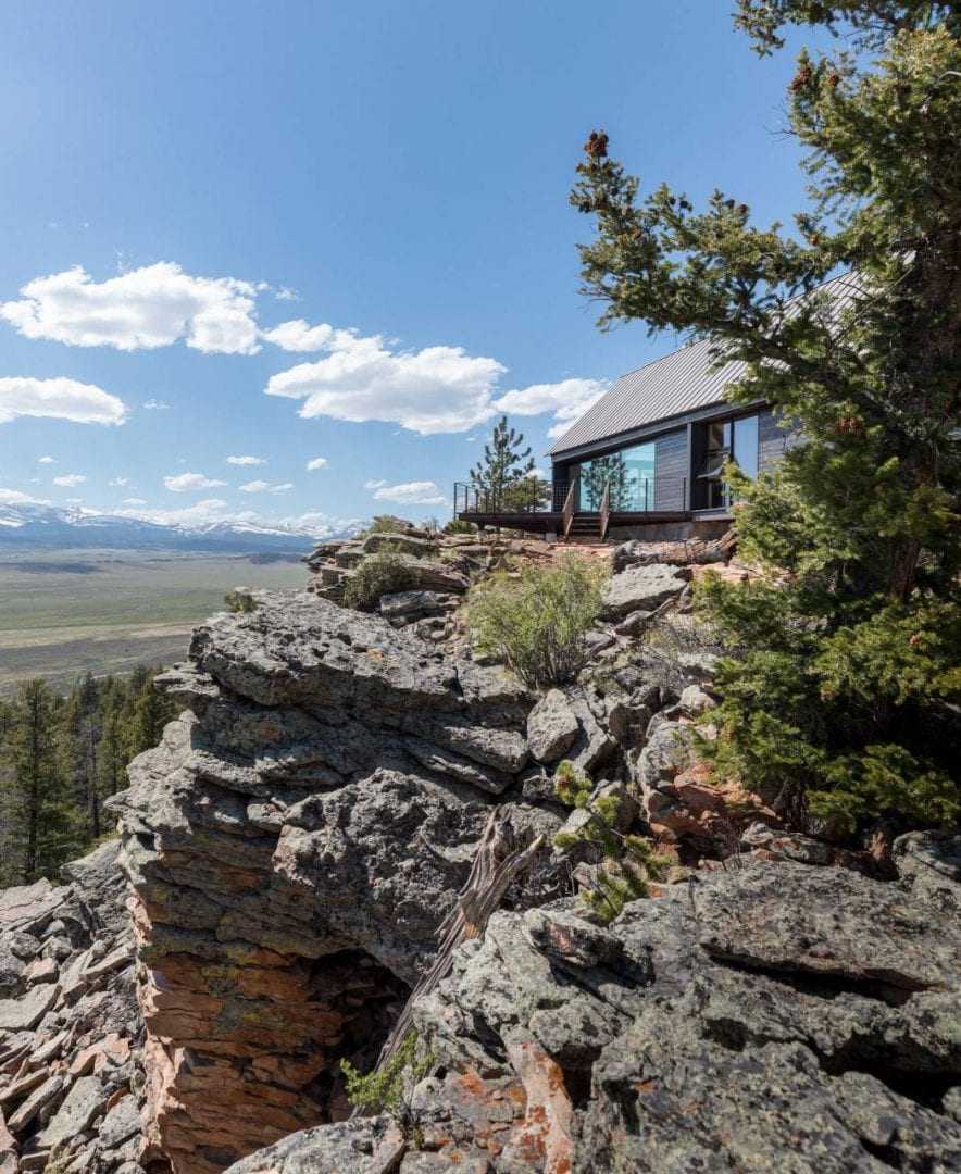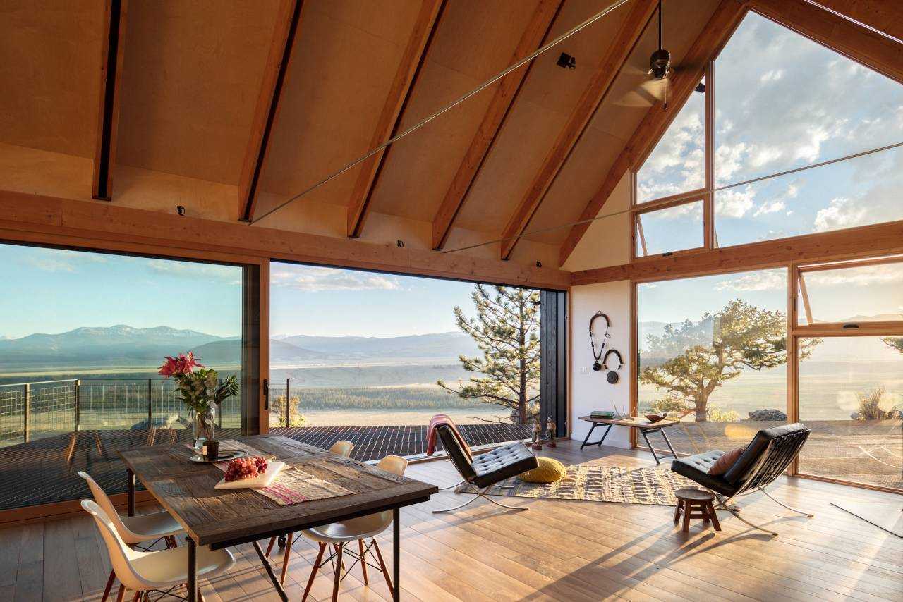 Set high on a rocky cliff overlooking Colorado’s Sangre de Cristo mountains, the pair of cabins recall the area’s early vernacular buildings with gabled roofs and rustic materials. Exterior cedar siding is stained dark to blend the house with the surrounding forest. Plywood interior walls and ceilings keep the cabin low-key and rustic. Large expanses of glass connect the occupants to the remarkable landscape beyond.