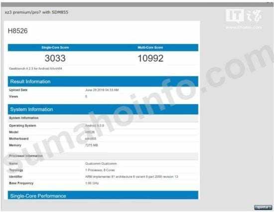 Με πολλές πιθανότητες να μιλάμε για το XZ3 2019, το σίγουρο είναι πως μιλάμε για ένα SoC με σκορ συσκευής 3033 σ single και 10992 σε multithread. Άρα είναι το γρηγορότερο SoC σήμερα αφού το Snapdragon 845 δίνει σε συσκευές 2400 για single και 9000 σε multithreaded score.