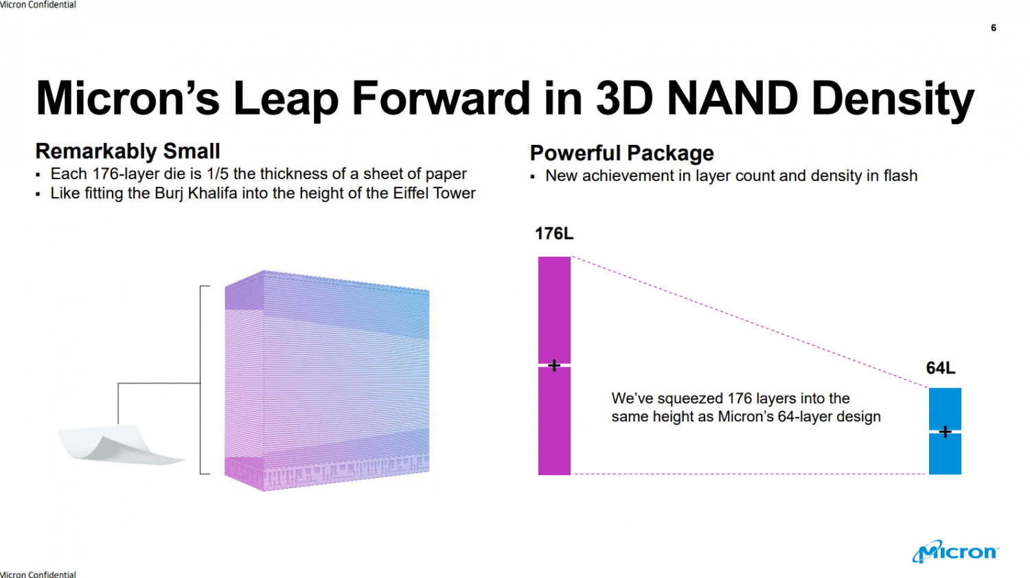 Η Micron μαθαίνουμε λοιπόν έχει βάλει σε παραγωγή SSD με δύο επίπεδα που έχουν 88 στρώματα NAND το κάθε ένα. Στόχος είναι μια συσκευή με 176 επίπεδα σε ένα ‘τσιπ’ που έχει πάχος 45 microns. Τι σημαίνει αυτό; Πως ένα τέτοιο κύκλωμα έχει το ίδιο πάχος με μια συσκευή με 64 στρώματα.