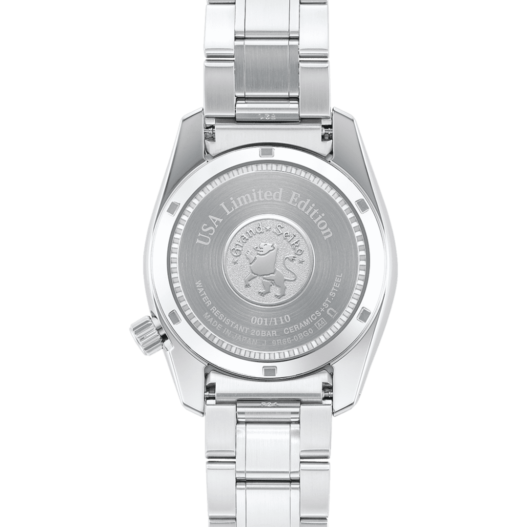 …special edition Spring Drive GMT. Οι Ιάπωνες έχουν βάλει μέσα έναν αποκλειστικό Spring Drive GMT για τις ΗΠΑ. Με διάμετρο 40.5mm και κατασκευή από ανοξείδωτο ατσάλι. Μέσα, ένας Grand Seiko 9R66 automatic Spring Drive μηχανισμός και απόθεμα 3 ημερών σε ενέργεια.